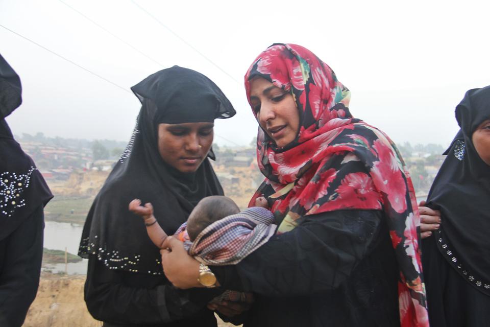 Tawakkol Karman, right, holds a Rohingya refugee child during her visit to Kutupalong refugee camp in Bangladesh. (AP Photo/Suzauddin Rubel)