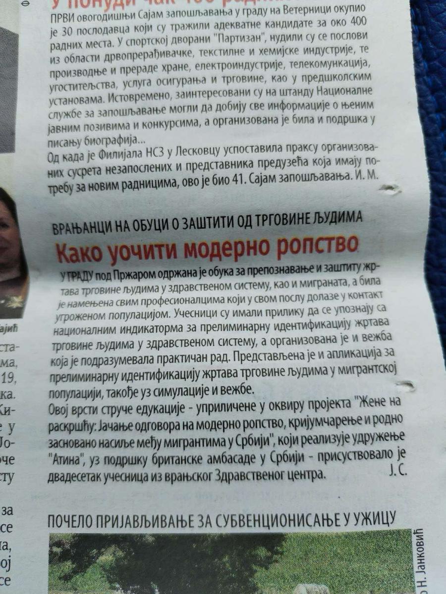 U okviru projekta „Žene na raskršću: Jačanje odgovora na moderno ropstvo, krijumčarenje i rodno zasnovano nasilje među migrantima u Srbiji“, koji sprovodi organizacija Atina uz podršku Britanske ambasade u Beogradu, a u saradnji sa Centrom za zaštitu žrtava trgovine ljudima, održane su dve obuke o identifikaciji i zaštiti žrtava trgovine ljudima u okviru zdravstvenog sistema, sa posebnim fokusom na žrtve trgovine ljudima iz migrantske populacije.Obuka je bila namenjena svim stručnjacima koji u okviru svog rada dolaze u kontakt sa žrtvama trgovine ljudima i migrantima.
