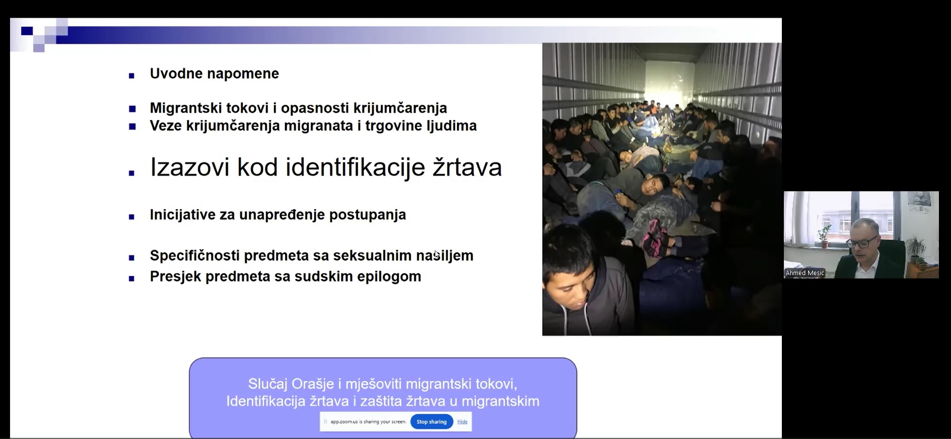 Sastanak je otvorila Jelena Hrnjak (Atina), nakon čega je usledila detaljna prezentacija tužioca Ahmeda Mešića iz Tužilaštva Bosne i Hercegovine, koji vodi Odsek za borbu protiv trgovine ljudima i krijumčarenja ljudi. Tužilac Mešić je predstavio slučaj identifikacije i gonjenja krivičnih dela trgovine ljudima nad maloletnim migrantima bez pratnje, ističući značaj poštovanja ljudskih prava tokom celokupnog postupka i rada pravosudnih i policijskih organa.
