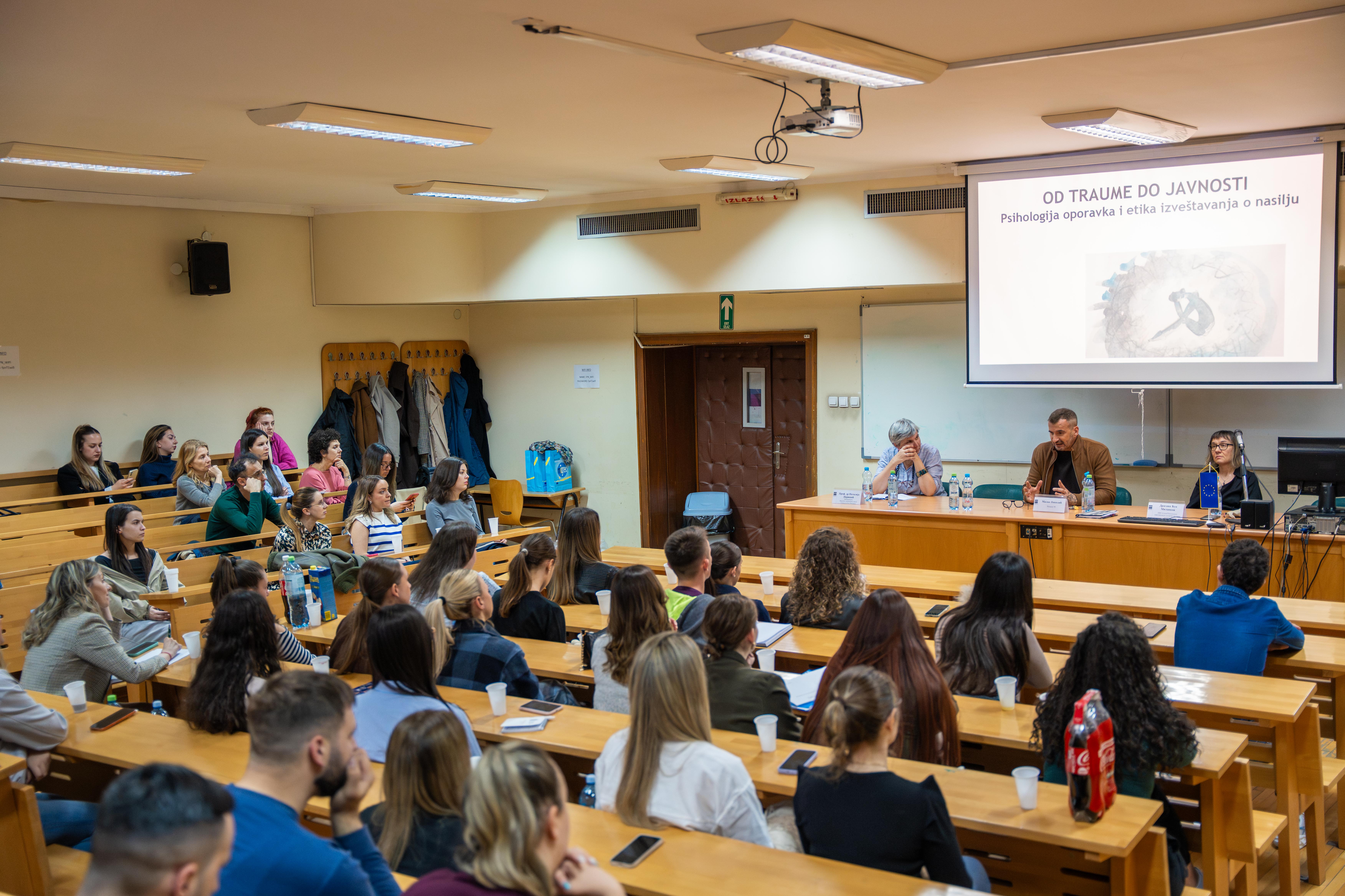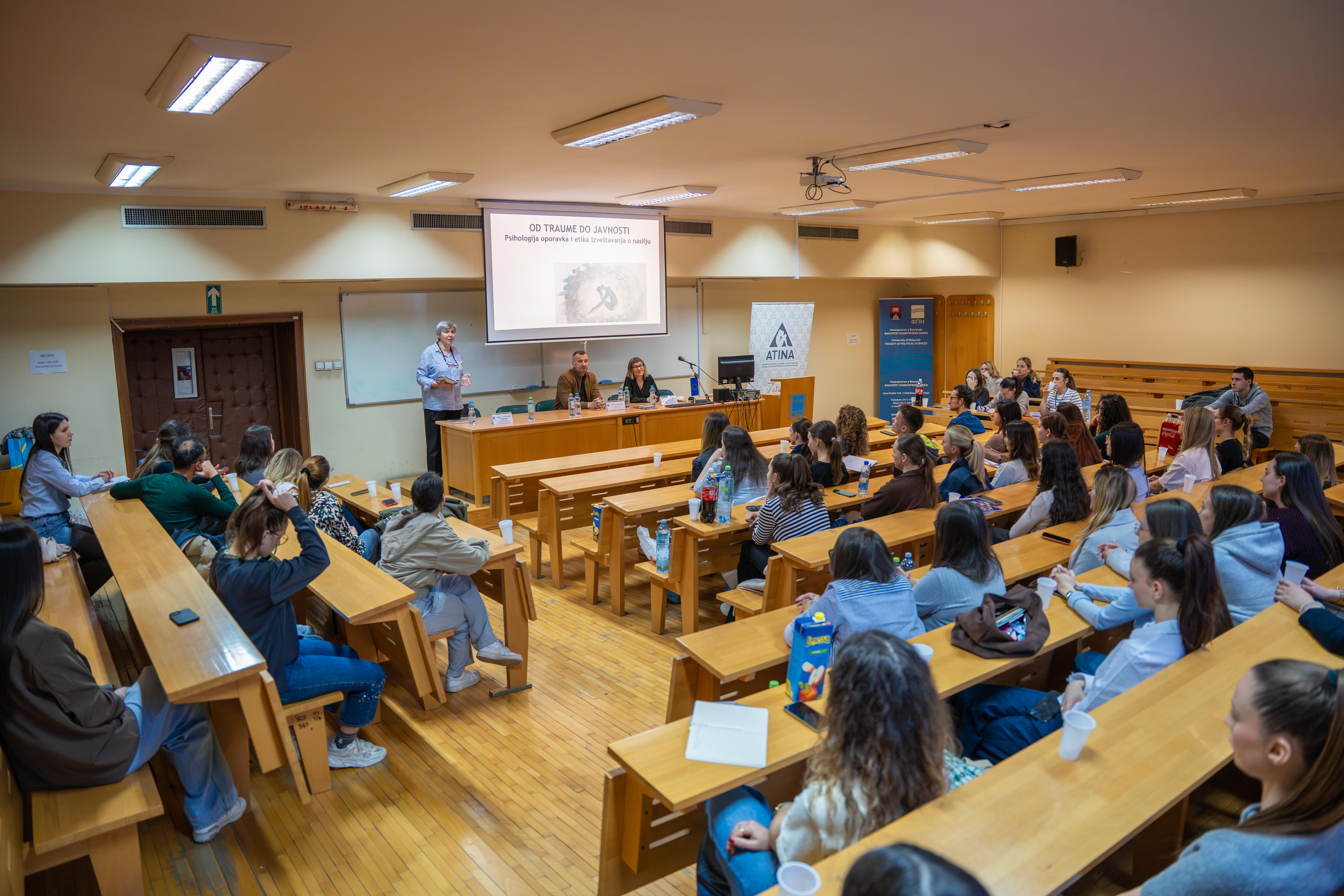 Tribina je okupila studente novinarstva i socijalnog rada, buduće profesionalce koji će u svom radu dolaziti u kontakt sa ljudima koji su preživeli nasilje, ali i stručnjake iz oblasti psihološke podrške i medija. Govorili su klinička psihološkinja i rukovoditeljka Psihološkog savetovališta za žrtve trgovine ljudima u Udruženju Atina, Dragana Ćuk Milankov, i novinar istraživačkog portala Insajder, Milan Nikolić. Razgovor je moderirala prof. dr Natalija Perišić.